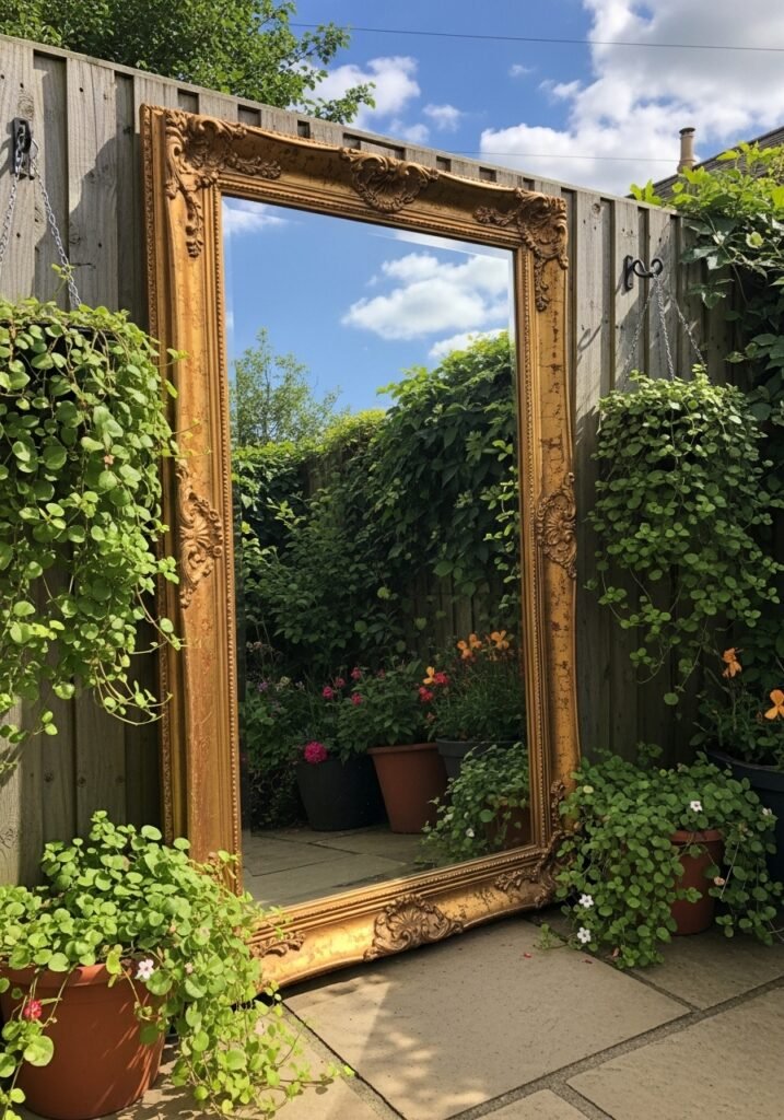 Hanging an outdoor mirror is a designer trick within small patio ideas on a budget that visually doubles your space. Place a large mirror on a fence or wall to reflect greenery, light, and the sky, creating an illusion of depth and spaciousness. Thrift stores are excellent sources for affordable mirrors in interesting frames.