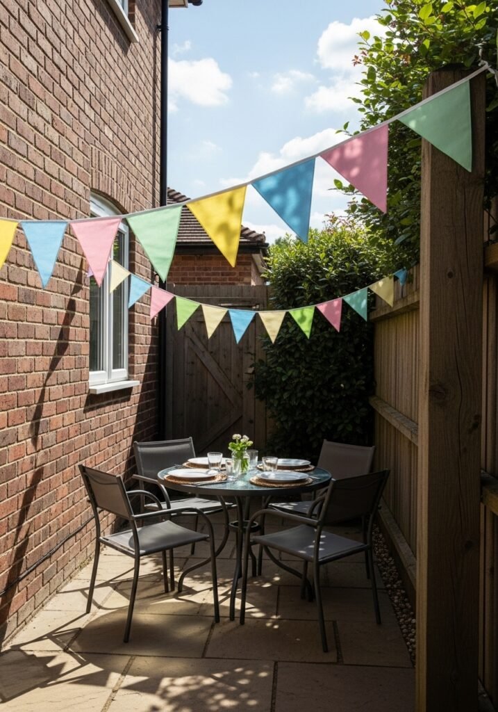 Stringing decorative garlands and bunting across your patio adds festive charm to small patio ideas on a budget. Make your own from fabric triangles, paper circles, dried flowers, or pom-poms strung on twine. These cheerful decorations add color, movement, and personality to any outdoor gathering space.