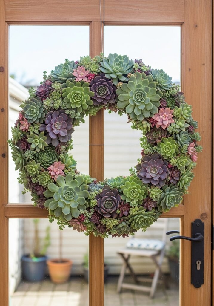 A living succulent wreath is a stunning door or wall accent in small patio ideas on a budget. Fill a wire wreath frame with sphagnum moss, then insert succulent cuttings throughout until the frame is completely covered. Over time, the succulents root and grow into a living, self-sustaining wreath.