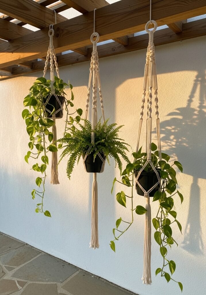 Macramé hanging planters bring bohemian charm to any small patio ideas on a budget project. You can learn basic macramé knots from YouTube tutorials and create beautiful plant hangers using inexpensive cotton rope or jute twine. Hang trailing plants like pothos, string of pearls, or ivy for a cascading green effect that adds life and texture.