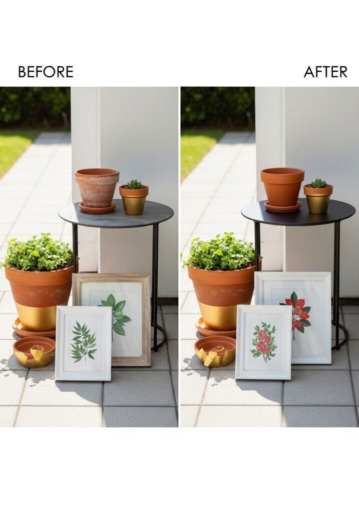Spray paint old terra cotta pots gold for instant glamour, refresh rusted furniture with matte black, or brighten dated frames with crisp white. Each can costs approximately five dollars and can update multiple items. This transformative approach breathes new life into everything on your small patio without buying a single new item.