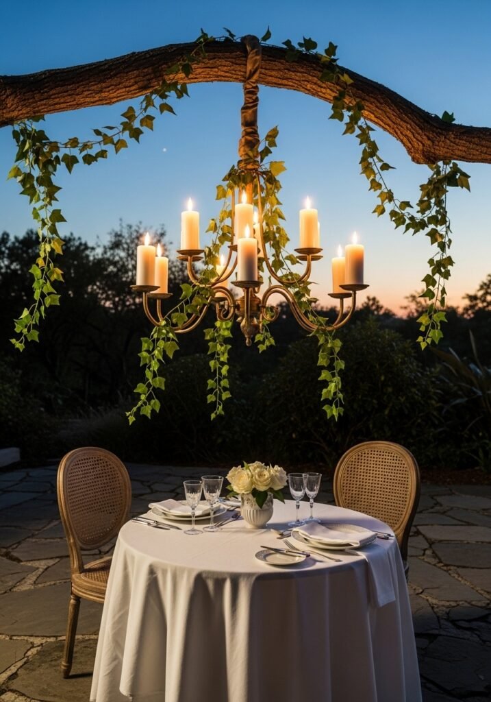 A DIY outdoor candle chandelier adds dramatic overhead beauty to small patio ideas on a budget. Repurpose an old chandelier frame from a thrift store by removing electrical components and adding candle cups or LED candles. Hang it from a tree branch, pergola beam, or ceiling hook for stunning elevated candlelight.