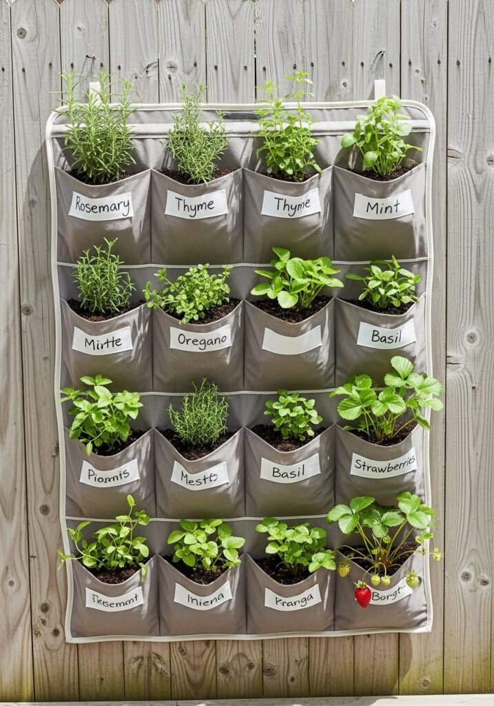 A hanging pocket shoe organizer makes a surprising vertical garden in small patio ideas on a budget. Hang a fabric or plastic over-the-door shoe organizer on your fence or wall and fill each pocket with soil and small plants, herbs, or succulents. Each pocket becomes an individual planter in this creative growing system.
