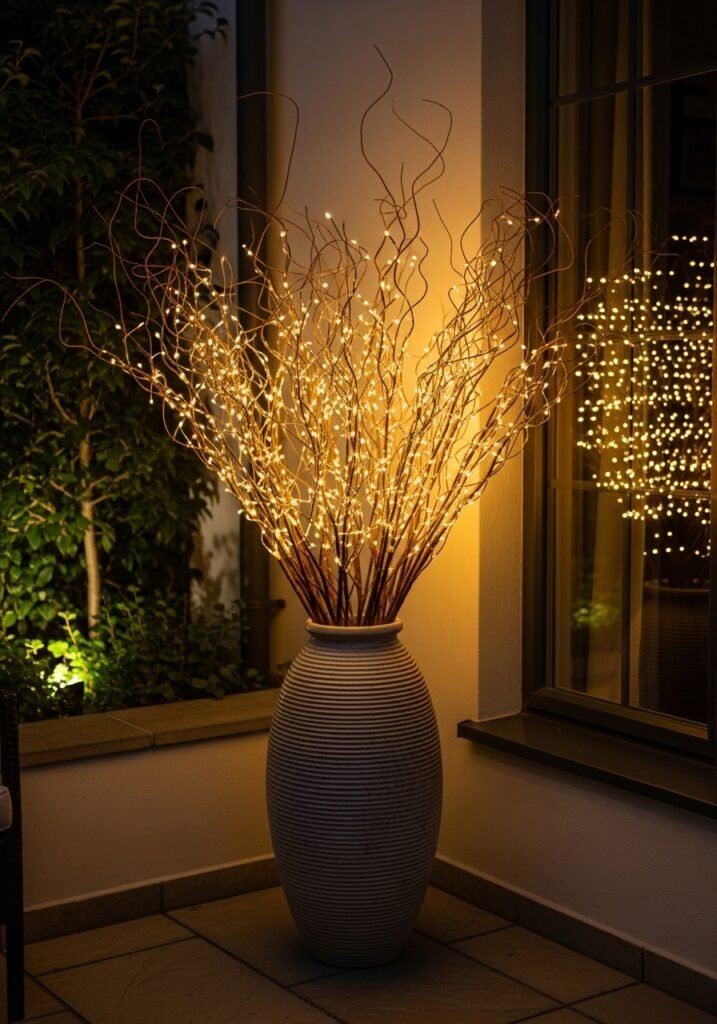 Creating a twinkling branch arrangement is a nature-inspired accent for small patio ideas on a budget. Place tall dried branches or curly willow sticks in a large floor vase, then wrap battery-operated fairy lights around the branches. The illuminated branches create a magical, tree-like light sculpture that glows beautifully in the evening.