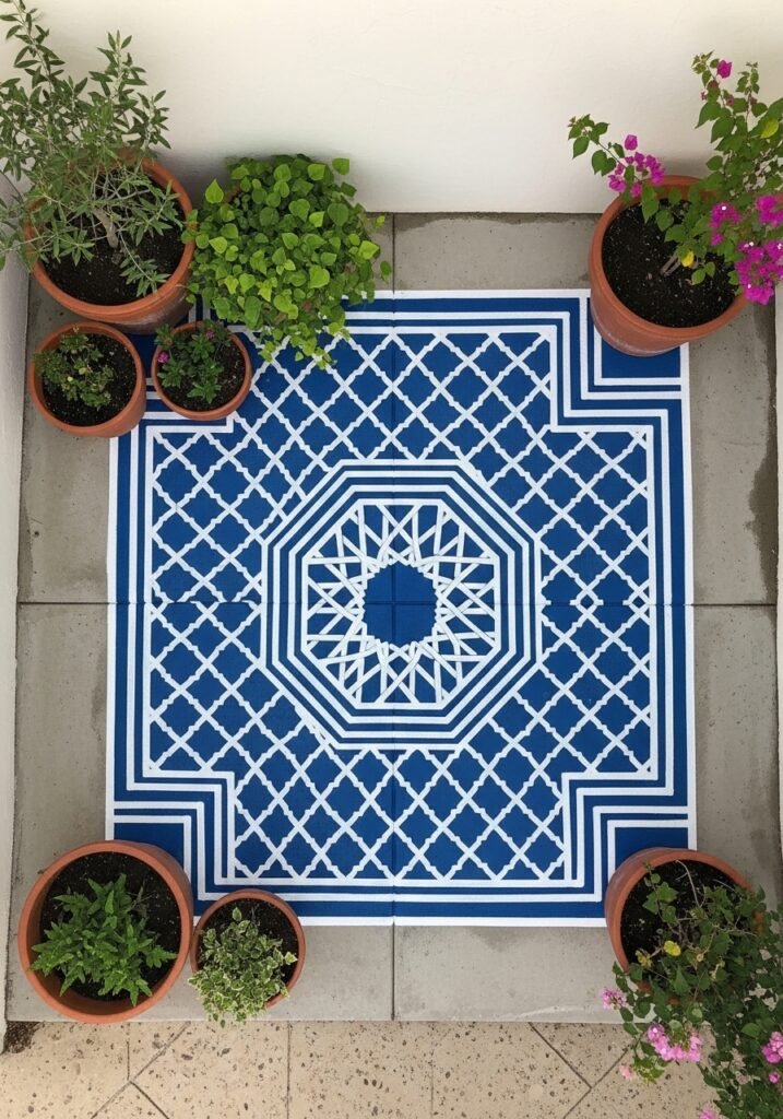 Painting your own outdoor rug from a canvas drop cloth is one of the most customizable small patio ideas on a budget. Purchase an inexpensive drop cloth, hem the edges, then paint bold patterns using masking tape, stencils, and exterior paint. Create stripes, chevrons, Moroccan tiles, or any design you can imagine.