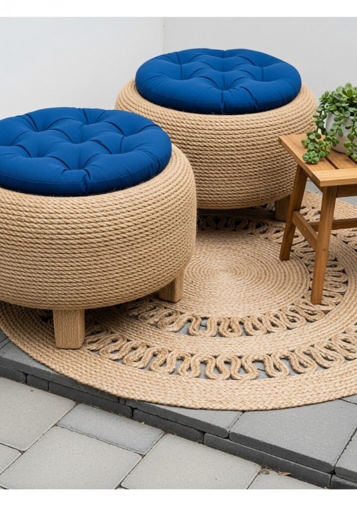 Turning old tires into outdoor ottomans is a clever and eco-friendly entry among small patio ideas on a budget. Wrap a clean tire with thick sisal rope or nautical rope using a hot glue gun, then top it with a round cushion or wooden circle. The result is a unique, conversation-starting piece of outdoor furniture.