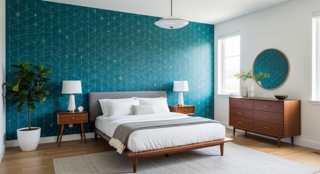 These pattern-focused teal bedroom ideas work especially well for those who love modern or mid-century design styles. Consider geometric wallpaper on one accent wall, or introduce the pattern through throw pillows and area rugs for a less permanent option. The structured nature of geometric patterns provides a nice contrast to soft bedding textures, creating a balanced, well-designed space.