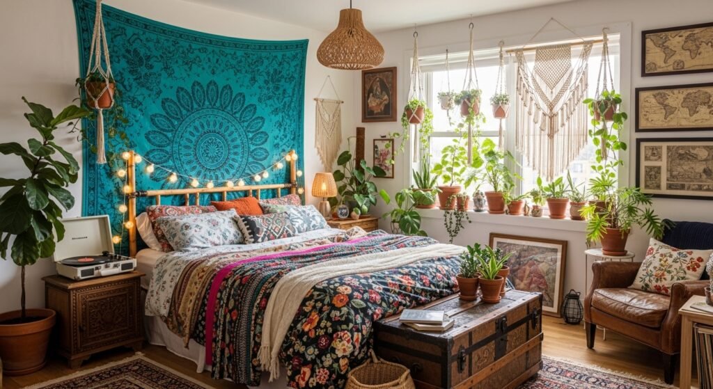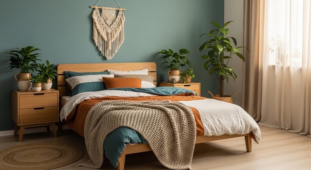These relaxed teal bedroom ideas celebrate individuality and creativity without strict design rules. Incorporate macramé wall hangings, plenty of plants, vintage furniture, and handmade items to enhance the bohemian vibe. The versatility of teal allows it to work with virtually any color combination in boho design, making it an ideal choice for this expressive, personal style.