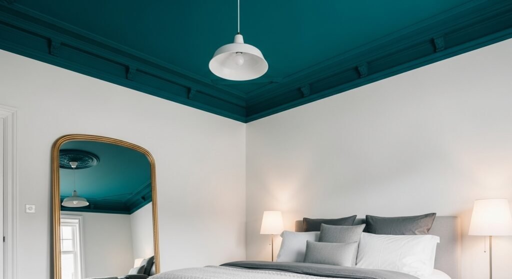 Among the most daring teal bedroom ideas, this approach definitely makes an impression. Keep walls neutral to let the ceiling be the star, or go all-in with teal walls too for a complete color immersion. Add white crown molding to define the space, and choose light-colored bedding and furniture to prevent the room from feeling too dark or enclosed.