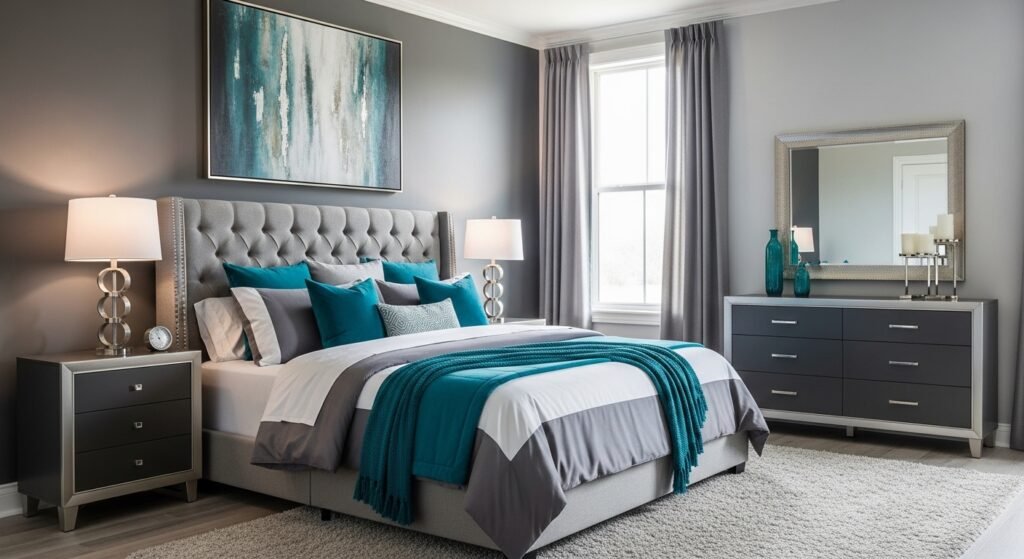 This ranks among the most popular teal bedroom ideas for modern homes and apartments. The gray grounds the teal, making it feel more mature and design-forward. Incorporate both colors through bedding, furniture, and accessories, and add metallic silver or chrome elements to enhance the contemporary aesthetic. This combination works beautifully in both large and small bedrooms.