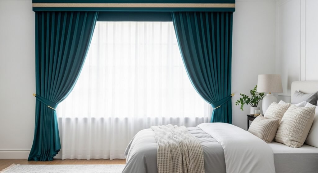 Frame your windows beautifully with teal curtains that add color without permanent commitment. Floor-to-ceiling teal drapes create vertical lines that make rooms appear taller while providing privacy and light control. This approach allows you to introduce teal into your bedroom design in a way that’s easily changeable with seasons or evolving tastes.