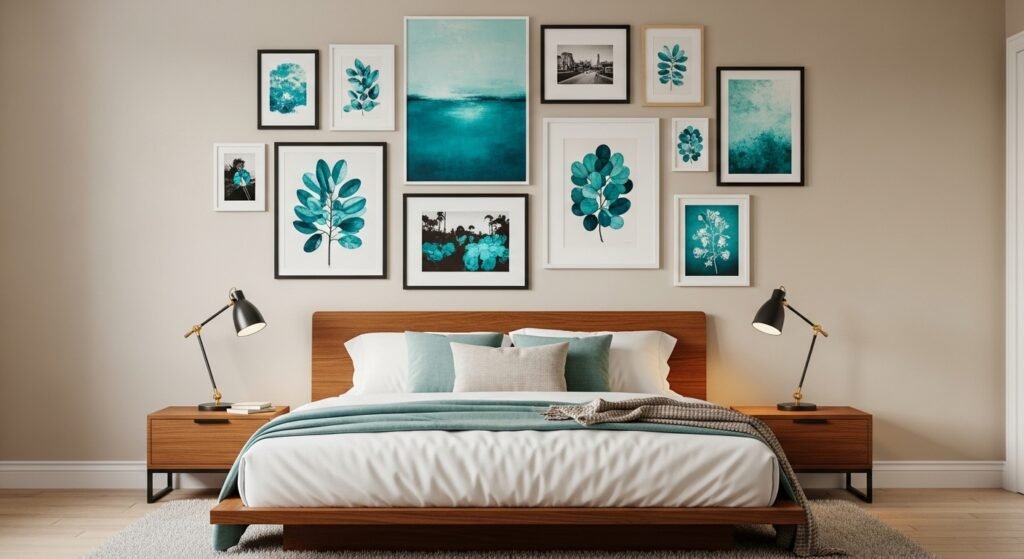 Create a cohesive gallery wall featuring artwork with teal as the unifying color. This approach brings teal into your bedroom through art rather than paint or furniture, offering a sophisticated and cultured look. Mix different frame styles, art mediums, and sizes while maintaining teal as a common thread throughout the collection.