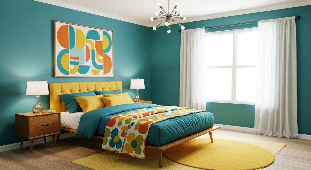 Energize your bedroom with the unexpected pairing of teal and mustard yellow. These complementary colors create visual excitement and a retro-inspired vibe that feels both nostalgic and fresh. The warmth of mustard yellow beautifully offsets the coolness of teal, creating a balanced and inviting space full of personality and charm.