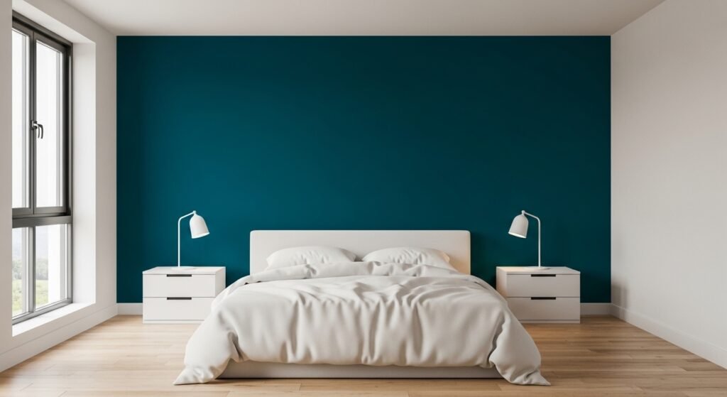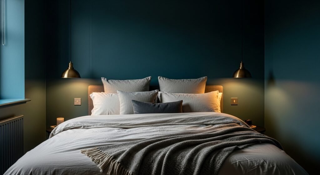 Embrace the drama with deep, moody teal walls that create an intimate, cocooning effect. Dark teal shades work surprisingly well in bedrooms, making the space feel warm and enveloping rather than small. This bold choice creates a sophisticated atmosphere that’s perfect for restful sleep, as the deeper tones naturally calm the mind and promote relaxation.