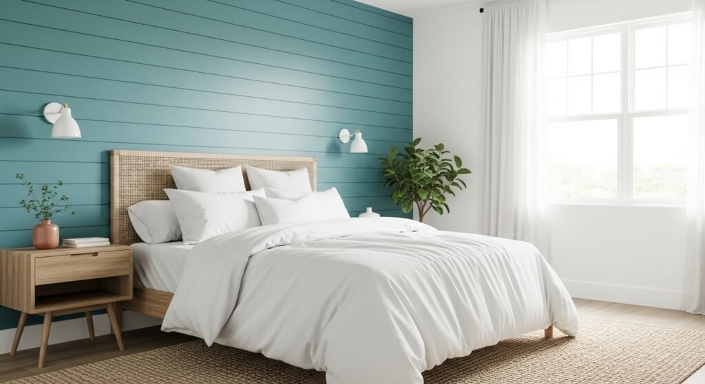 Add architectural interest with teal-painted shiplap or wall paneling that brings texture and dimension to your bedroom. This approach combines the trending appeal of shiplap with the sophisticated color of teal, creating a custom look that feels high-end. The horizontal or vertical lines created by paneling add visual movement and can make rooms appear larger or ceilings higher.