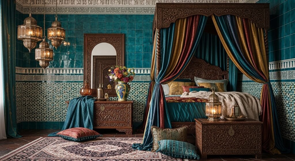 Transport yourself to an exotic retreat with Moroccan-inspired teal bedroom ideas featuring intricate patterns and rich textures. Incorporate teal through ornate tile patterns, carved wooden furniture, metallic lanterns, and sumptuous fabrics. The deep, jewel-toned quality of teal works beautifully in Moroccan design, creating spaces that feel luxurious and transportive.