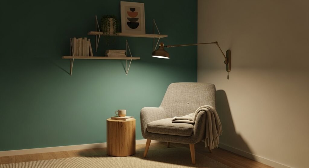 Create a cozy reading corner in your bedroom using a teal accent wall and comfortable seating. This dedicated space becomes a retreat within a retreat, perfect for unwinding with a good book. A teal backdrop creates a calming atmosphere that encourages relaxation while defining the nook as a special zone separate from the sleeping area.