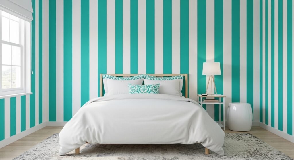 Create visual interest with teal and white striped walls that add pattern without overwhelming the space. Stripes can run horizontally to make rooms appear wider or vertically to create the illusion of height. This classic pattern feels both timeless and fresh, bringing energy to your bedroom while maintaining the calming properties of teal.