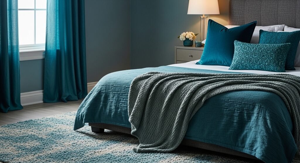 These textural teal bedroom ideas demonstrate that you don’t need multiple colors to create an interesting space. The variety of textures—from smooth cotton to plush velvet to chunky knits—provides visual and tactile interest that keeps the eye engaged. This layered approach works beautifully in any season, with the ability to add or remove layers for temperature comfort and seasonal style updates.