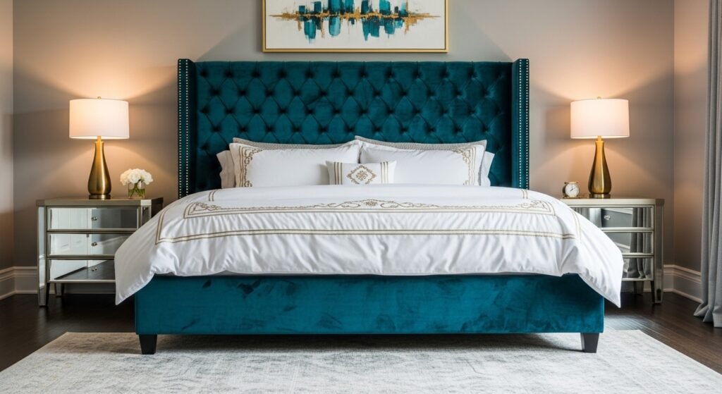 A luxurious teal velvet headboard instantly elevates your bedroom’s sophistication level. The rich texture of velvet catches light beautifully, creating depth and visual interest that draws the eye. Choose a tufted or channel-stitched design for added elegance, and watch how this single piece transforms your entire sleeping space into a boutique hotel-worthy retreat.