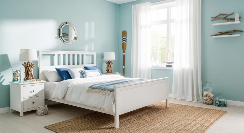Bring the serenity of the ocean into your bedroom with a coastal-inspired teal and white color scheme. This refreshing combination evokes feelings of seaside relaxation and creates a light, breezy atmosphere perfect for unwinding. Use various shades of teal from aqua to deep ocean blue, mixed with crisp whites and natural textures like jute and driftwood.