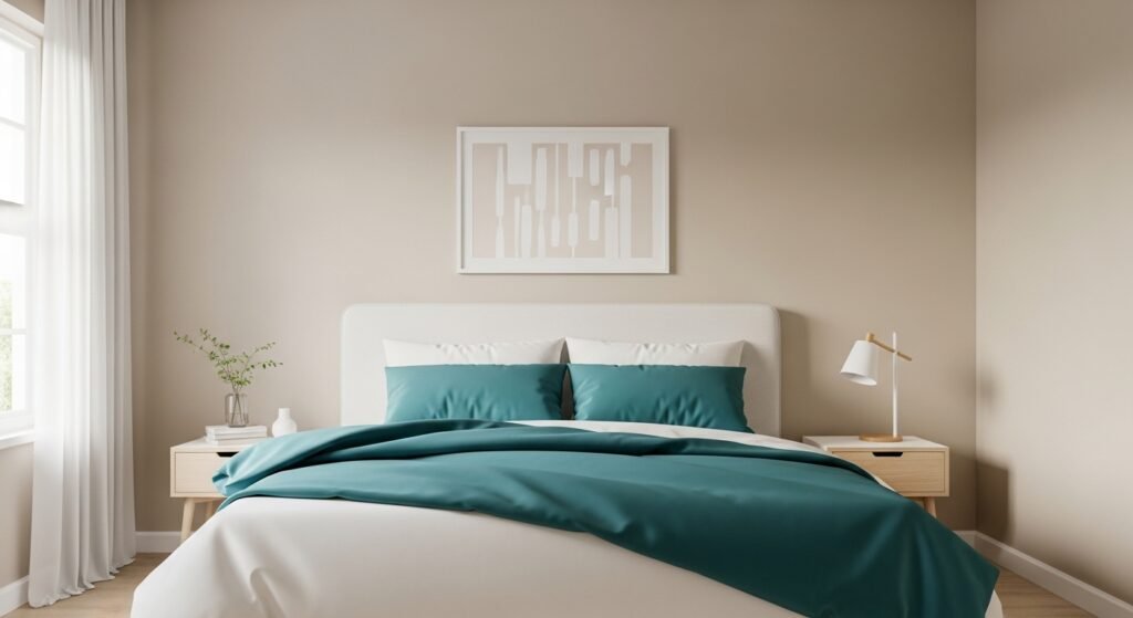 Layer different shades of teal in your bedding, from pillowcases to throws, to create depth and visual interest. Keep your walls neutral in shades of white, beige, or light gray to let the bedding shine as the room’s focal point. This versatile approach means you can easily refresh your bedroom’s look seasonally by simply swapping out textiles.