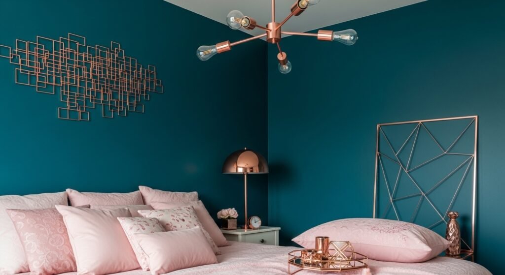 Create a feminine yet sophisticated space by pairing teal with soft blush pink accents. This unexpected color combination feels fresh and modern while maintaining a gentle, romantic quality. The coolness of teal perfectly balances the warmth of blush, creating a harmonious palette that’s both calming and visually interesting.