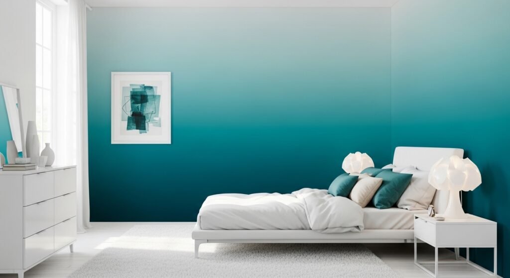 Create visual drama with an ombre wall treatment that transitions from deep teal at the bottom to lighter aqua or white at the top. This artistic approach adds dimension and interest to your bedroom while maintaining the calming properties of teal. The gradient effect draws the eye upward, making ceilings appear higher and rooms feel more spacious.