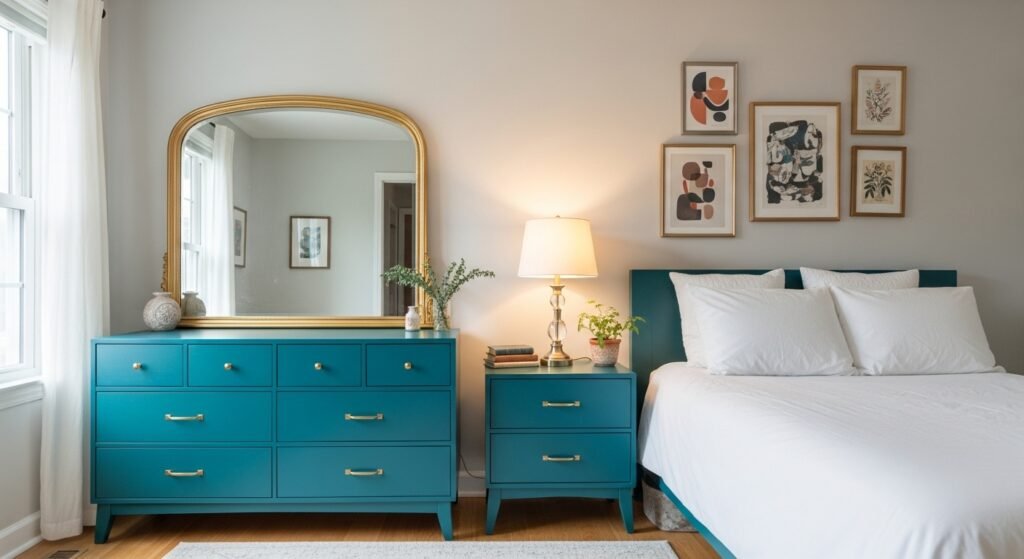 Incorporate teal through furniture rather than walls for a unique twist on traditional bedroom design. A teal dresser, nightstand, or armchair becomes a striking focal point that adds personality without overwhelming the space. This approach offers flexibility, as furniture pieces can move with you or be repainted if your tastes change over time.