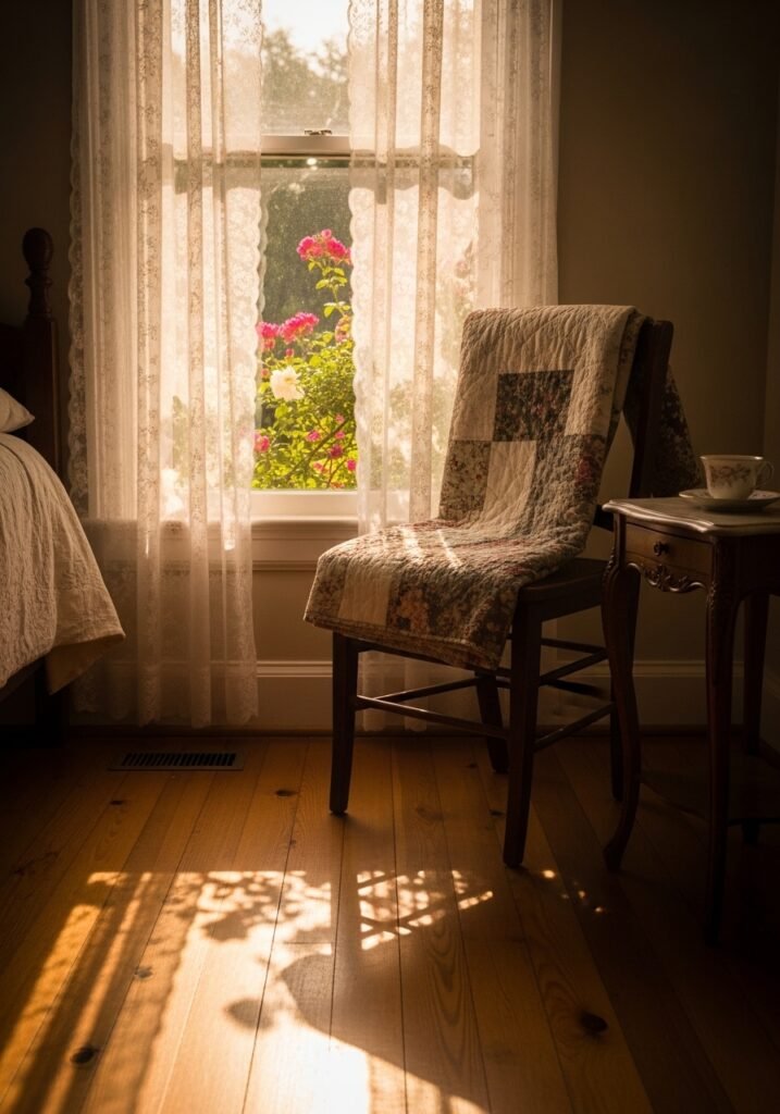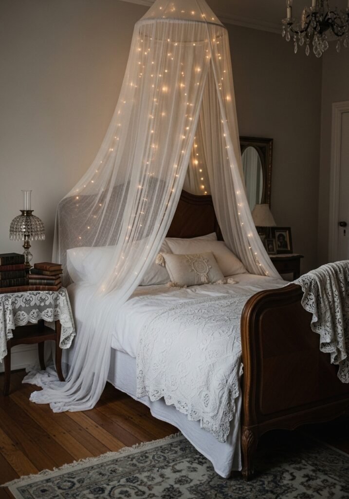 Lace curtains remain one of the most beloved vintage bedroom ideas because they’re simple yet transformative. Layer them over heavier drapes for a luxurious look, or let them stand alone for an airy feel. The intricate patterns cast beautiful shadows when sunlight streams through, adding another layer of visual magic to your vintage bedroom.