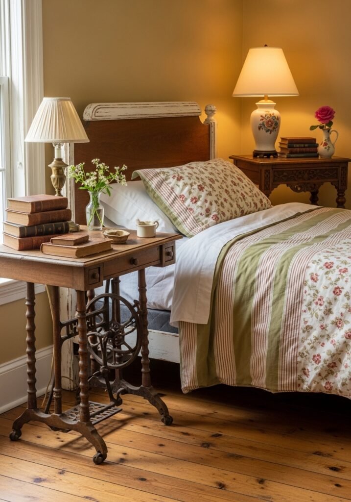 Mismatched antique nightstands are among the most charming vintage bedroom ideas because they create an effortlessly curated look. One side might feature a small writing desk while the other holds a repurposed sewing table. Top them with vintage lamps, stacked old books, and a small vase of flowers for a perfectly styled bedside scene.