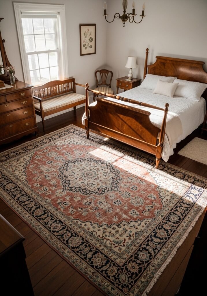 Incorporating a vintage rug is one of the most impactful vintage bedroom ideas because it instantly defines the space. The naturally worn colors and soft patina of an aged rug bring authenticity that new rugs can’t match. Visit antique markets, online auctions, or specialty rug dealers to find the perfect piece for your retreat.