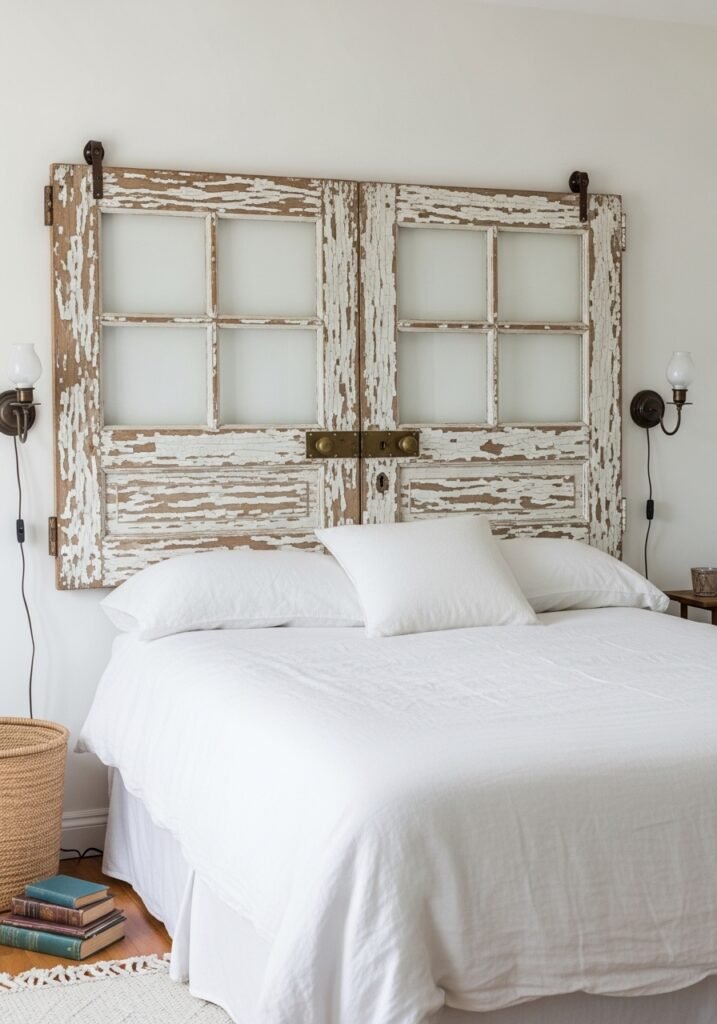Using a repurposed vintage door as a headboard is a creative and sustainable design choice. Old paneled doors with original hardware, peeling paint, or glass panes make stunning statement pieces. Lean a single door against the wall or mount it horizontally for a wider headboard that adds architectural interest.