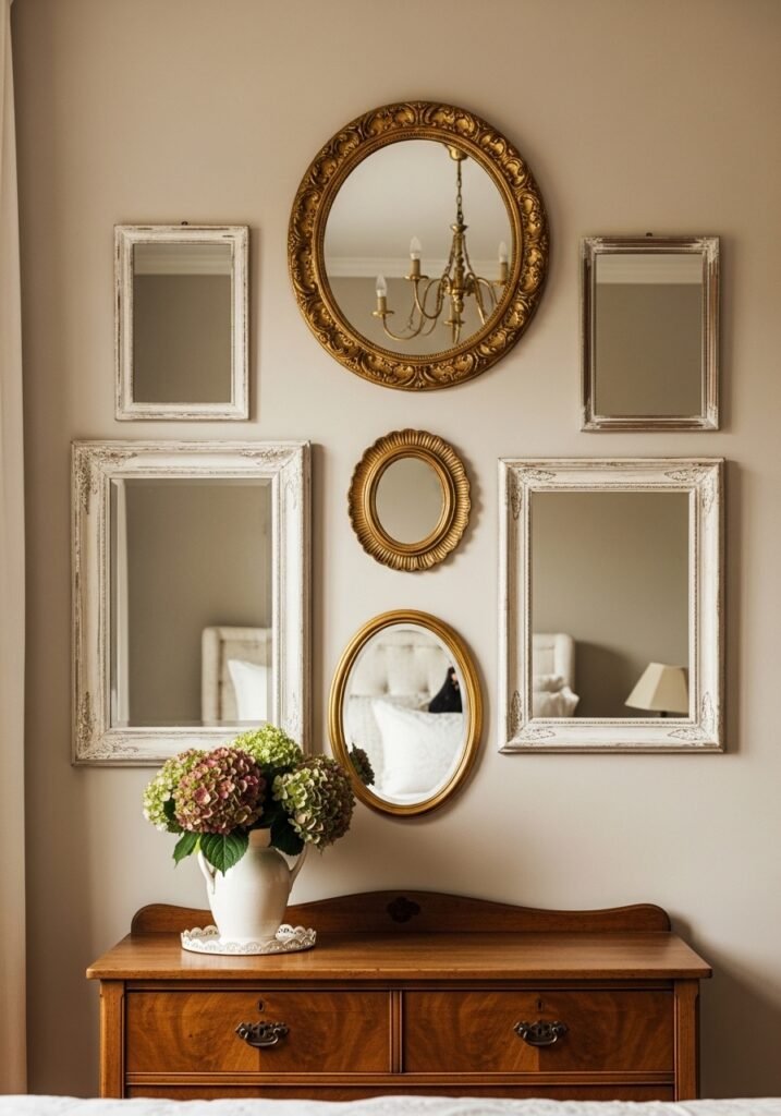 Grouping several vintage mirrors together on one wall creates a stunning, light-reflecting display. Mix ornate gilded mirrors with simple wooden-framed ones in various shapes and sizes. This arrangement not only adds vintage character but also makes the bedroom feel larger and brighter by bouncing light throughout the space.
