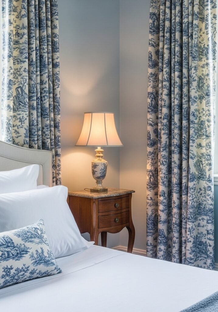 Incorporating Toile de Jouy fabrics into your bedroom brings classic French vintage elegance. These scenic printed fabrics typically feature pastoral landscapes, romantic figures, or botanical scenes in a single color on a light background. Use toile for curtains, pillow covers, duvet covers, or upholstered furniture to create a sophisticated vintage look.