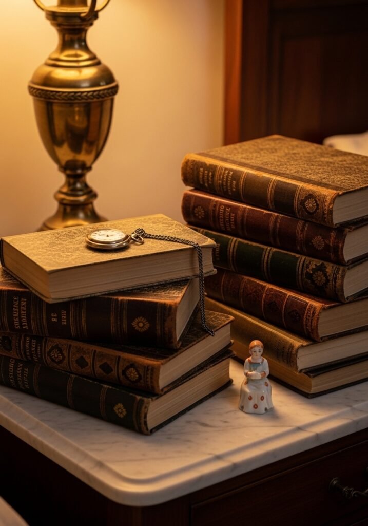 Decorating with antique books is one of the simplest vintage bedroom ideas that makes a huge visual impact. Group books by color for a curated look or mix them randomly for an eclectic vibe. Top each stack with a small vintage object like a pocket watch, a tiny frame, or a porcelain figurine for a perfectly styled vignette.