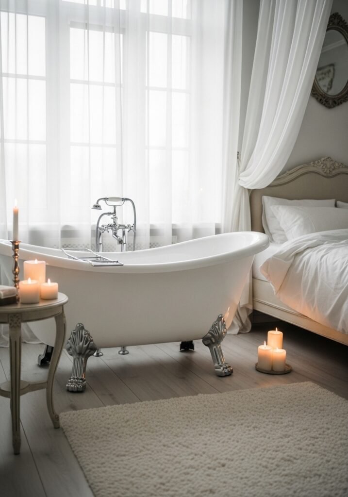 This is one of the most aspirational vintage bedroom ideas that generates massive engagement on Pinterest. The cast iron tub with its curved silhouette and ornate feet becomes a sculptural centerpiece. Surround it with candles, a vintage side table holding bath essentials, and a plush rug beneath for a truly magazine-worthy vintage bedroom moment.