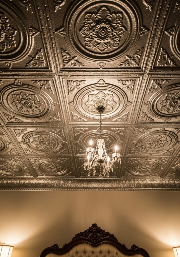 Pressed tin ceilings are among the most distinctive vintage bedroom ideas that add incredible character to a space. Choose from silver, copper, brass, or painted white finishes depending on your desired aesthetic. The play of light across the textured surface creates subtle shadows and depth that make the ceiling a genuine work of art.