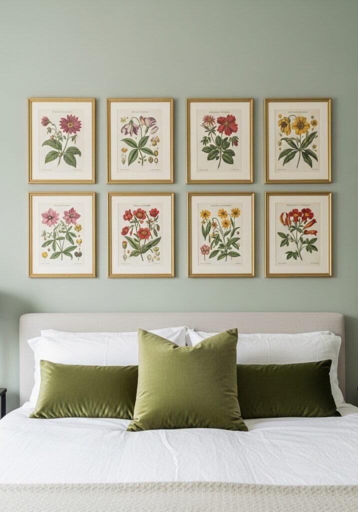 Botanical prints are among the most versatile vintage bedroom ideas because they work with nearly every color scheme and design style. Arrange a symmetrical grid of four or six prints above the bed, or scatter them around the room. The combination of natural beauty and vintage illustration style creates a calming, scholarly atmosphere perfect for the bedroom.