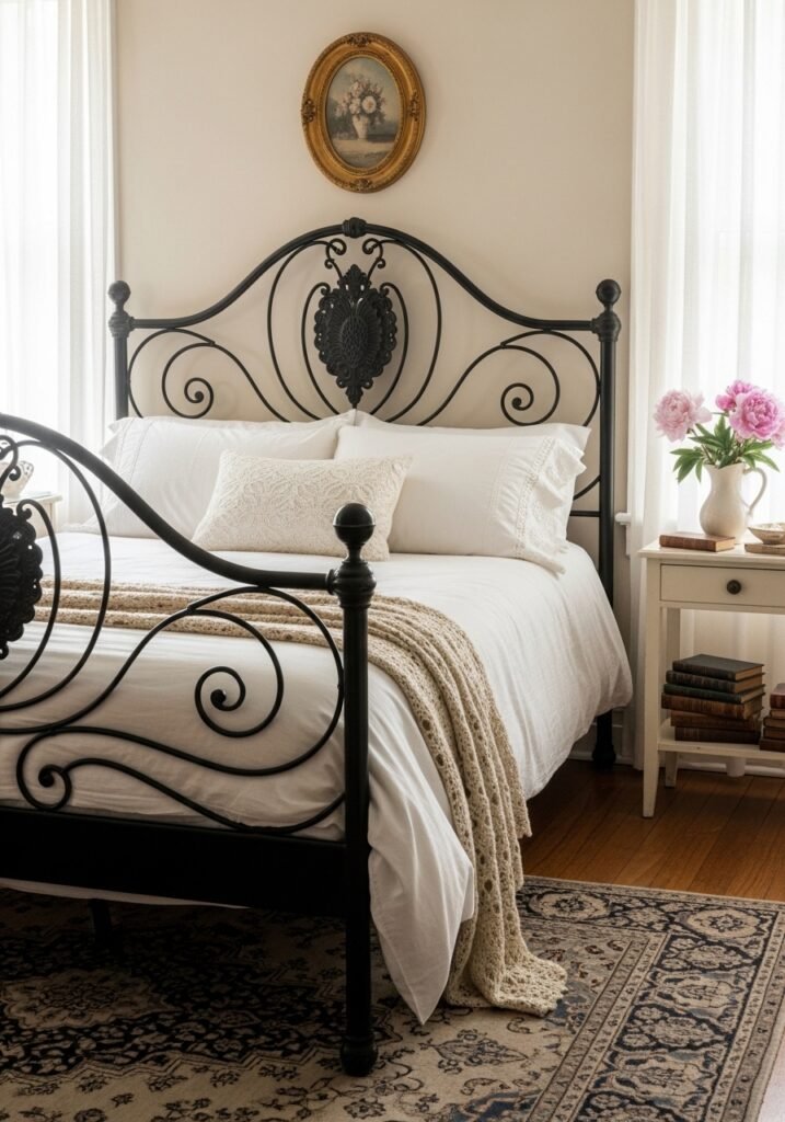 Among all vintage bedroom ideas, the iron bed frame remains a Pinterest favorite because of its versatility. You can dress it up with a canopy or keep it minimal for a farmhouse feel. Add a plush mattress and layered quilts to create an inviting look that begs you to curl up and stay awhile.
