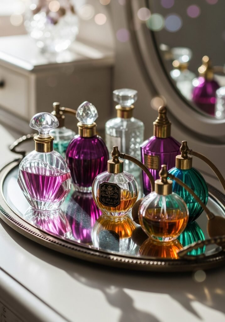 Displaying a collection of vintage perfume bottles on a vanity or shelf adds sparkle and feminine charm. Art Deco crystal flacons, colored glass bottles, and ornate atomizers become miniature works of art. Group them on a mirrored tray or antique silver platter for an elegant, curated presentation.