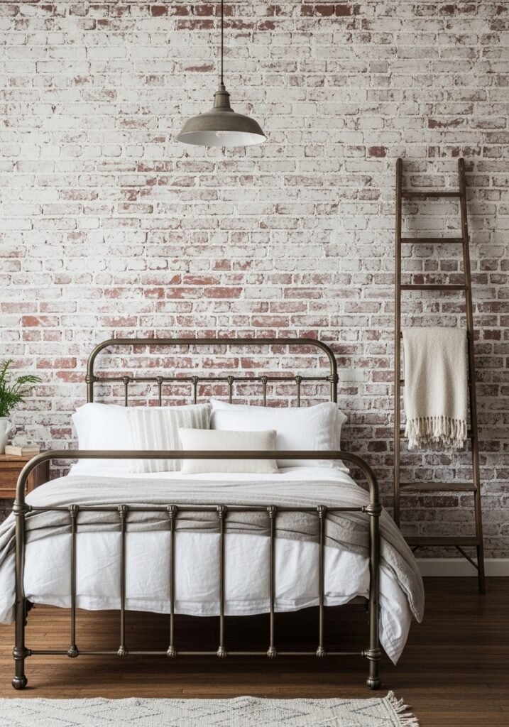 A whitewashed brick wall in the bedroom creates a beautiful backdrop that’s both rustic and refined. The texture of exposed brick peeking through white paint adds depth and character that flat walls simply can’t achieve. This treatment works especially well behind the headboard, creating a stunning focal point.