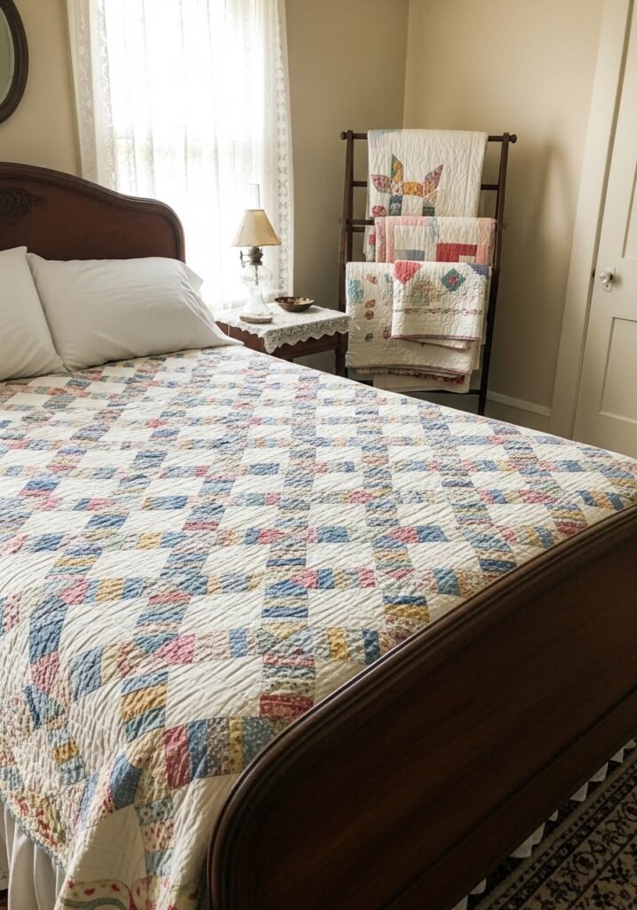 Vintage quilts are some of the most sentimental vintage bedroom ideas you can incorporate. Fold one neatly at the foot of the bed, drape it casually over a quilt rack, or use it as your primary bedcover. The hand-stitched details and slightly faded fabrics bring an authenticity and coziness that modern bedding simply cannot replicate.