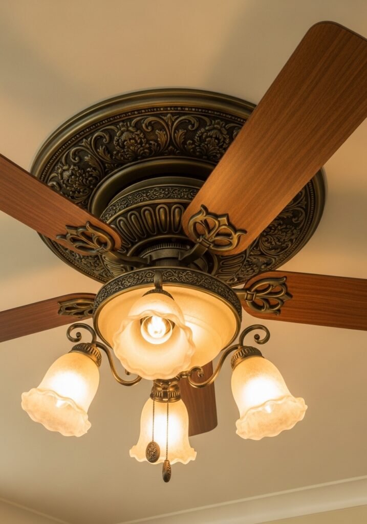 Replacing a modern ceiling fan with an antique-style model adds both function and vintage flair. Look for fans with ornate metalwork, wooden blades, and integrated light fixtures featuring glass shades. Bronze, brass, or aged copper finishes complement vintage décor perfectly while keeping the room comfortable.