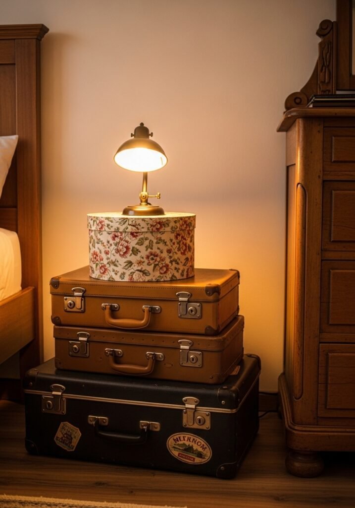 Stacking vintage suitcases in a corner or beside the bed creates eye-catching storage with incredible character. Old leather cases, floral fabric-lined boxes, and hard-shell luggage in various sizes and colors become a vertical display of travel nostalgia. Each suitcase can store seasonal items, accessories, or keepsakes.
