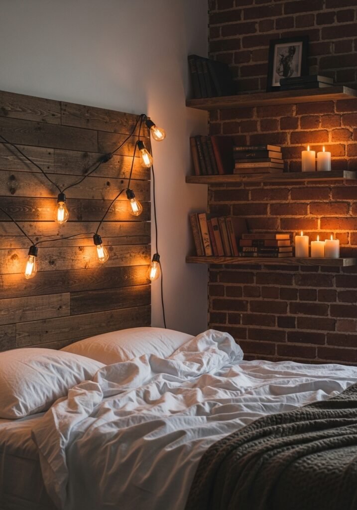 Incorporating exposed Edison bulb lighting adds a warm, amber glow reminiscent of the early twentieth century. Use them in vintage-style pendant fixtures, wall sconces, or simply draped as string lights across the headboard wall. The visible filaments create a cozy, romantic ambiance that’s perfect for the bedroom.