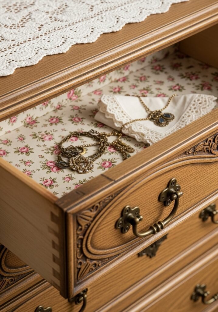 Lining the backs of bookshelves, inside dresser drawers, or on wardrobe interiors with vintage wallpaper adds hidden surprise and delight. Choose small-scale floral, toile, or damask patterns in complementary colors. This unexpected detail elevates ordinary furniture and adds layers of vintage charm that reveal themselves gradually.