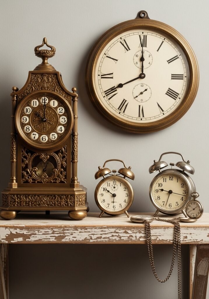 Displaying a collection of antique clocks on a wall, mantel, or shelf adds both visual interest and nostalgic charm. Mix styles like schoolhouse wall clocks, ornate mantel clocks, small alarm clocks, and pocket watches for an eclectic vintage grouping. The patina of aged metals and faded clock faces creates beautiful texture.