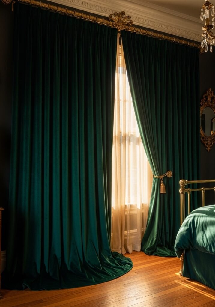 Floor-to-ceiling drapes are among the most impactful vintage bedroom ideas for creating a cocoon-like atmosphere. The weight and texture of the fabric dampen sound, block light, and add a sense of opulence. Hang them on decorative vintage rods with ornate finials for an authentic, sophisticated vintage look that transforms the entire room.