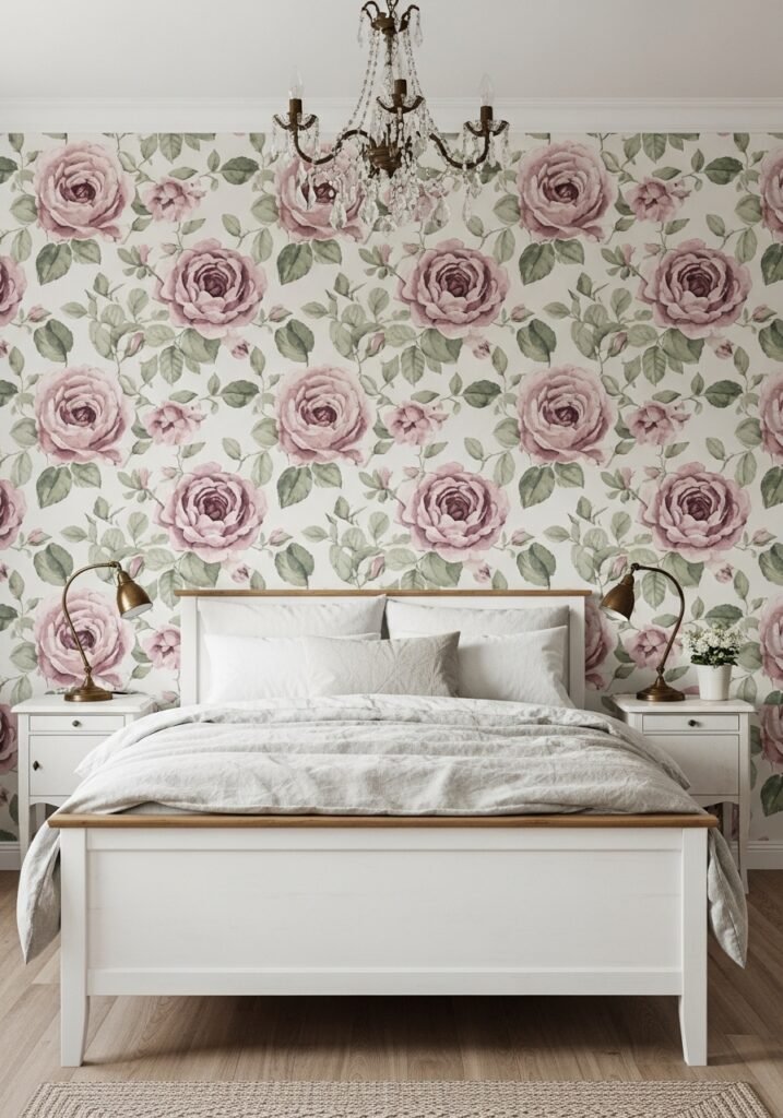 A floral wallpaper accent wall is one of the most pinned vintage bedroom ideas for a reason. Large-scale roses, peonies, or wildflower patterns in muted tones like dusty pink, sage green, or soft blue create a romantic backdrop that feels timeless. Choose one wall behind the headboard to make a dramatic yet tasteful statement without overwhelming the room.